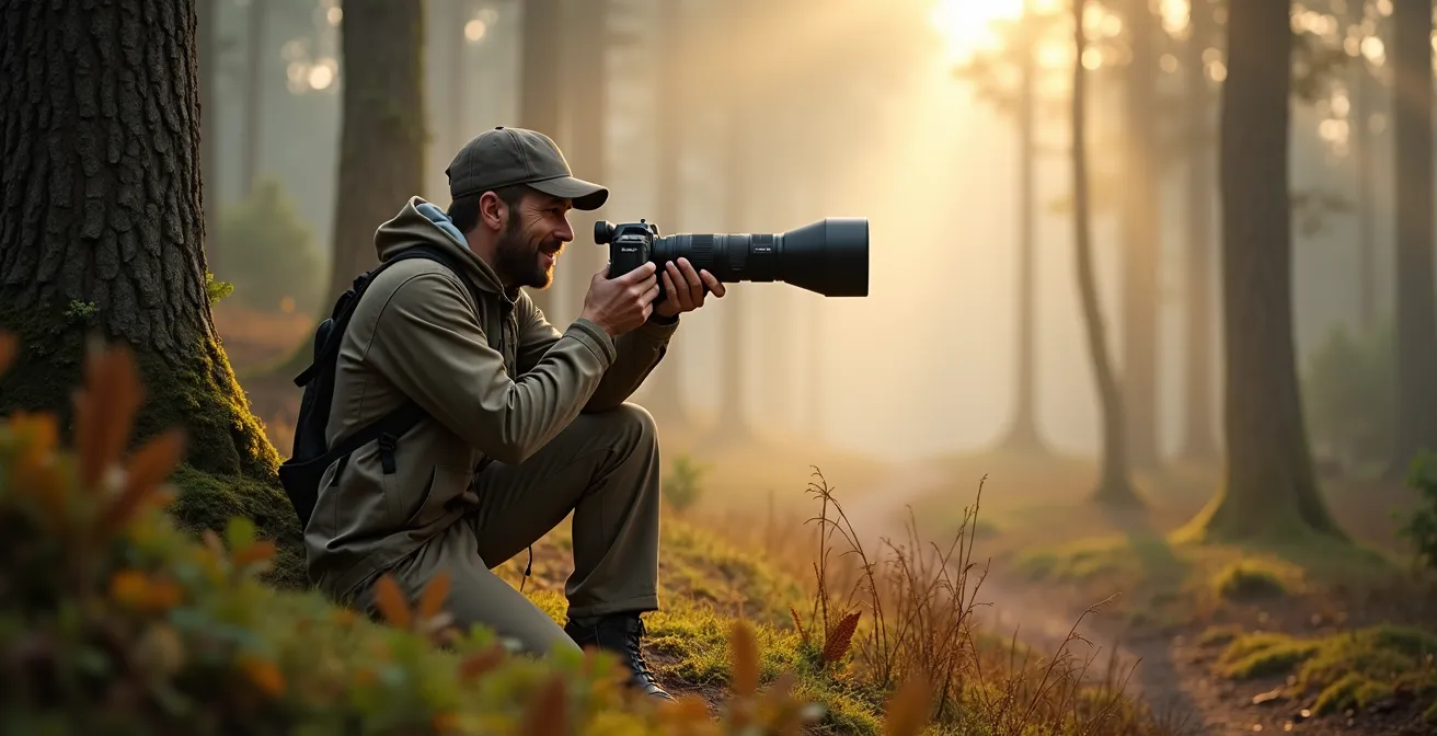 L’image est un cliché pour de nombreux photographes amateurs : un magnifique cerf, mais tout ce que l’objectif capture est une croupe tachetée disparaissant dans les fourrés. Cette frustration est le point de départ d’une quête, souvent marquée par une course à l’armement : des téléobjectifs plus longs, des boîtiers plus rapides, des tenues de camouflage toujours plus sophistiquées. Certains, poussés par l’envie d’obtenir « le » cliché, tombent même dans les pratiques controversées de l’appâtage (le « baiting »), sacrifiant l’intégrité de la vie sauvage pour une image facile. Ces approches partent d’un postulat erroné : celui de devoir vaincre la nature pour la photographier.